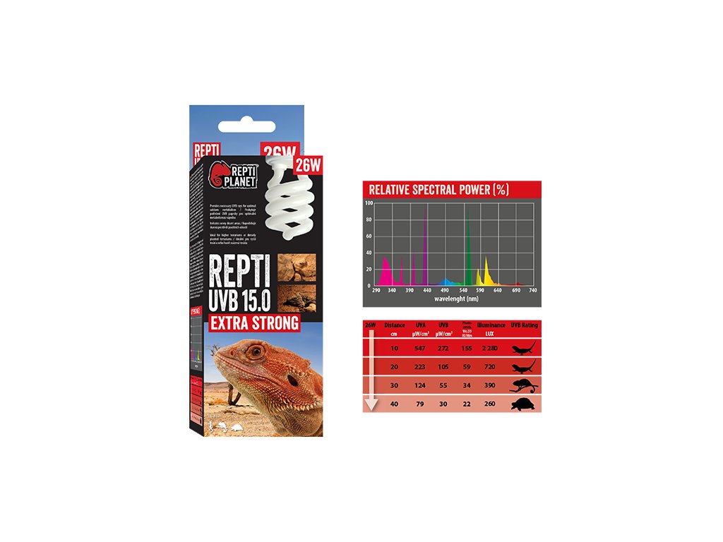 REPTI PLANET UVB 15.0 nevyzařují dostatek tepelného a světelného záření. V případě potřeby kombinujte s výhřevnými žárovkami a plnospektralním světlem.